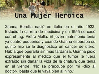 Gianna Beretta, una mujer heroica que se negó a sacrificar la vida de su hijo a pesar de ser diagnosticada con cáncer, fue beatificada por Juan Pablo II. El documento también discute el quinto mandamiento que prohíbe el homicidio, el aborto y la eutanasia, afirmando que la vida humana es sagrada y solo Dios es su dueño. Se enfatiza la necesidad de rechazar el odio y trabajar por la paz, así como el deber de cuidar la vida y la salud.