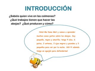 El documento habla sobre las abejas y la vida en una colmena. Introduce a las tres castas de abejas - la reina, los zánganos y las obreras - y sus roles. Explica que las obreras recogen néctar, limpian la colmena y producen miel, cera y otros productos mientras la reina pone huevos. Finalmente, propone una actividad para que los estudiantes representen un día típico en la colmena.