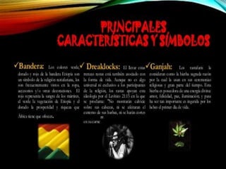 El documento describe las características comunes de la cultura rastafari, incluyendo hacerse rastas y rendir culto a Jah, y proporciona detalles sobre Bob Marley, el famoso cantante rastafari jamaiquino nacido en 1945 que compuso populares canciones de reggae como "Don't Worry Be Happy" y falleció en 1981.
