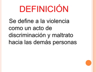 La violencia se define como un acto de discriminación y maltrato que puede manifestarse de varias formas como violencia infantil, familiar, psicológica, social o política. Estos actos de violencia traen consecuencias dañinas para la salud como lesiones, homicidios y daños físicos y psicológicos. El elemento esencial de la violencia es causar daño físico o psicológico a través de estímulos nocivos como lesiones, humillaciones o amenazas.