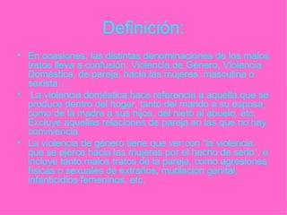 Este documento trata sobre la violencia de género y la violencia doméstica. Define la violencia de género como la violencia ejercida hacia las mujeres por el hecho de ser mujeres, e incluye malos tratos de pareja y agresiones físicas o sexuales. Incluye un testimonio real de una mujer que fue maltratada psicológica y físicamente por su pareja, y frases célebres sobre la violencia.