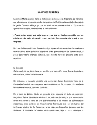 La Virgen María se apareció sobre la cúpula de la Iglesia de la Virgen en El Cairo, Egipto durante más de un año entre 1968 y 1969. Millones de testigos presenciaron y fotografiaron a María flotando sobre la iglesia. La Iglesia Ortodoxa Griega, a la que pertenece la iglesia, aprobó la naturaleza sobrenatural de las apariciones. El mensaje de María fue pedir a los fieles que creyeran en su presencia celestial y se concentraran en Dios, no en los ídolos