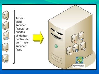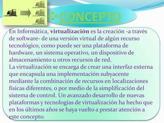 Este documento describe conceptos clave sobre virtualización como la creación de versiones virtuales de recursos tecnológicos a través de software. Explica beneficios como reducción de costos y mejor administración, así como desventajas como menor rendimiento y riesgos de seguridad. Finalmente, detalla software común para virtualización como VMWare, Hyper-V, Xen y VirtualBox, e indica que se puede virtualizar Windows, Linux y MacOS.