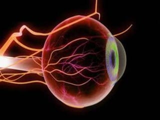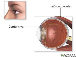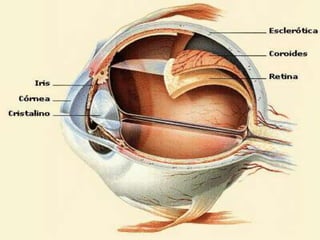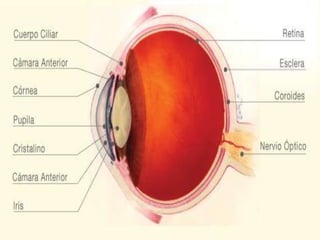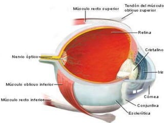 El documento describe las diferentes partes del ojo y sus funciones. Menciona la córnea, iris, pupila, conjuntiva, esclera, cámaras del ojo, vítreo e iris y explica brevemente qué son y cuáles son sus principales características y enfermedades asociadas.