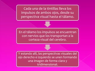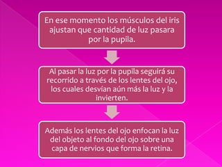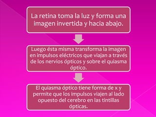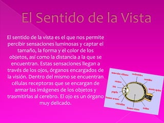 El documento resume los principales órganos involucrados en la visión como la córnea, iris, pupila, retina, nervio óptico, quiasma y corteza cerebral. Explica que la vista es el sentido que nos permite percibir la luz y captar características de los objetos como el tamaño, forma y color. El proceso de la visión involucra a estos órganos y el cerebro para formar imágenes y transmitir la información visual.