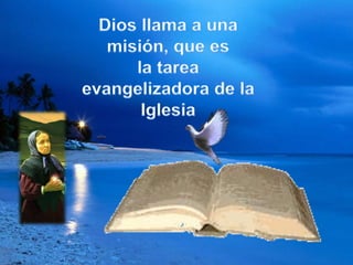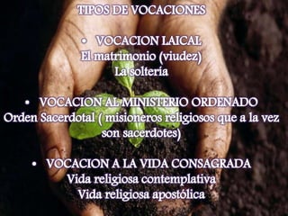 El documento habla sobre la vocación religiosa, explicando que la llamada de Dios es un acto gratuito y amoroso que requiere exclusividad, prontitud y una opción definitiva. Describe las características de una vocación auténtica como personal, libre, consciente y responsable, fruto de una experiencia de fe dentro de una historia concreta. Finalmente, destaca que la misión religiosa consiste en servir a los demás de manera urgente y ardua, amando a Dios a través del cuidado de los enfermos.