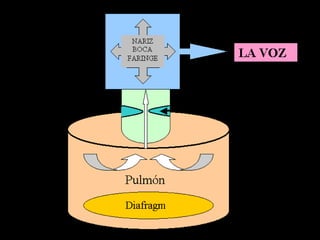 Este documento describe la anatomía y el funcionamiento de la voz humana. Explica que la voz se produce cuando el aire pasa a través de las cuerdas vocales en la laringe, causando su vibración. También describe los tres pasos en la producción de la voz y los diferentes tipos de disfonía que pueden ocurrir. Además, proporciona recomendaciones para el cuidado de la voz, como evitar el ruido, hablar en exceso, fumar y beber alcohol.
