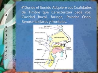 Este documento describe la producción de la voz humana. Explica que la voz se produce cuando el aire pasa a través de las cuerdas vocales en la laringe, haciéndolas vibrar. Luego describe los tres componentes del sistema vocal: el aparato respiratorio, el aparato de fonación y el aparato resonador. Finalmente, discute los tipos de disfonías y ofrece consejos para el cuidado de la voz.