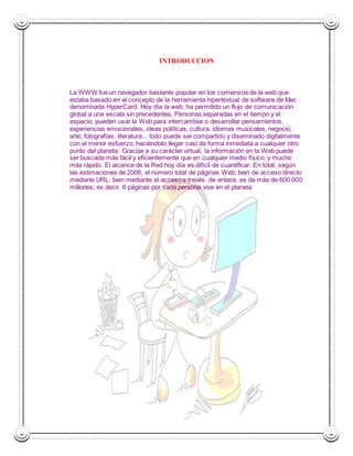 El documento habla sobre la evolución de Internet y la web. Explica que la Web 1.0 permitía solo leer información, mientras que la Web 2.0 facilitó el intercambio de información entre usuarios a través de redes sociales. La Web 3.0 optimiza el acceso e intercambio de información. Finalmente, la Web 4.0 facilita la investigación a través de un sistema de respuesta tan rápido como el cerebro humano.