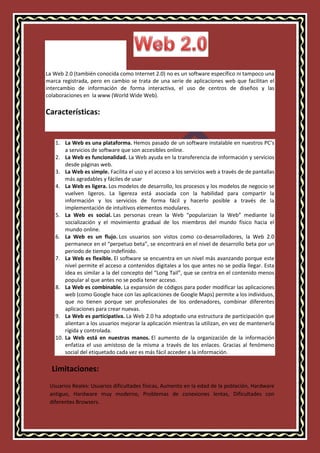 El documento describe las características de la Web 2.0, incluyendo que facilita el intercambio interactivo de información, el uso de centros de diseño y la colaboración en la web. Explora las limitaciones de acceso a la Web 2.0, como dificultades físicas de los usuarios, hardware antiguo y conexiones lentas. Finalmente, discute la necesidad de que la tecnología de la información ofrezca servicios públicos de manera adecuada y conveniente para todos los ciudadanos.