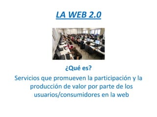 LA WEB 2.0 ¿Qué es? Servicios que promueven la participación y la producción de valor por parte de los usuarios/consumidores en la web