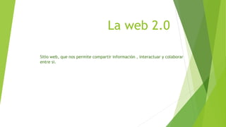 La web 2.0 permite compartir información e interactuar entre usuarios, permitiendo que los sitios web sean plataformas donde las personas pueden colaborar y compartir información.