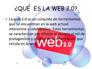 La Web 2.0 se refiere a un conjunto de herramientas interactivas y colaborativas en la web actual que permiten a los usuarios participar y compartir información, como blogs, wikis y redes sociales. Estas herramientas facilitan el intercambio interactivo de información entre usuarios y tienen diseños centrados en la experiencia del usuario.