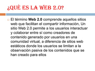 La Web 2.0 se refiere a sitios web que facilitan el intercambio y creación de contenido por parte de los usuarios. A diferencia de la Web 1.0 que tenía contenido estático creado por pocos, la Web 2.0 es colaborativa y dinámica, permitiendo que los usuarios interactúen y generen nuevo contenido de manera constante. Algunos ejemplos de sitios Web 2.0 son Google Maps, YouTube, SlideShare y Scribd.