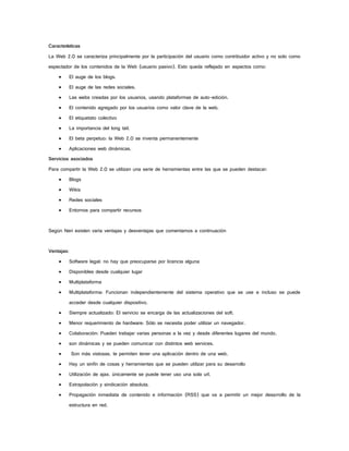 La Web 2.0 surgió en la década de 1990 cuando Tim Berners-Lee y Robert Cailliau crearon la World Wide Web. El término Web 2.0 se popularizó en 2004 para referirse a sitios web interactivos donde los usuarios participan activamente publicando y compartiendo contenido. Las características clave de la Web 2.0 incluyen blogs, redes sociales, contenido generado por usuarios y aplicaciones web dinámicas.