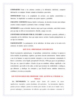 La Web 2.0 se caracteriza por la comunicación abierta y la distribución de contenido generado por usuarios. A diferencia de la Web 1.0, donde la información se encuentra en sitios separados, la Web 2.0 permite compartir y extraer contenido de diferentes fuentes. Los ideales de la Web 2.0 incluyen la comunicación, reputación, transparencia, compartir, simplicidad y participación. El aprendizaje constructivo se basa en que los estudiantes construyen conceptos a partir de sus estructuras de conocimiento previas. La Web 2.0 camb