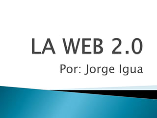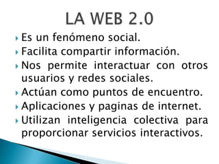 La Web 2.0 permite a los usuarios compartir y modificar información fácilmente a través de aplicaciones y páginas web interactivas. Facilita la interacción entre usuarios y el uso de la inteligencia colectiva para proporcionar servicios. Promueve una nueva forma de interactuar con contenidos como videos e imágenes a través de redes sociales que integran comunidades de aprendizaje.