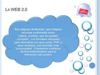 La Web 2.0 se refiere a páginas web dinámicas que integran recursos multimedia como videos y sonidos que los usuarios pueden compartir, utilizando tecnologías como JavaScript y PHP que permiten mayor interactividad. Estas páginas web tienen interfaces fáciles de usar para que los usuarios interactúen y comparten contenido.