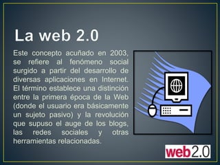 El concepto de web 2.0, acuñado en 2003, describe la transición de una web estática hacia una más interactiva, donde los usuarios son participantes activos a través de plataformas como blogs y redes sociales. Esta revolución ha cambiado nuestra relación con la información, permitiendo una mayor colaboración y enriquecimiento del contenido. Las aplicaciones web 2.0 ofrecen amplias oportunidades para la educación, facilitando la interacción y el trabajo cooperativo entre docentes y alumnos.