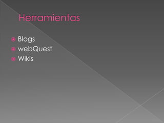 La web 2.0 ofrece herramientas como blogs, webQuest y wikis que permiten una mayor interacción entre usuarios y la creación colaborativa de contenido en comparación con las primeras versiones de la web. Estas herramientas comparten características como permitir que los usuarios publiquen, editen y comenten contenido de forma colaborativa.