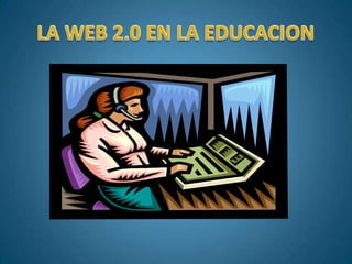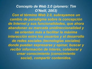 Este documento describe la Web 2.0 y sus implicaciones educativas. Define la Web 2.0 como una evolución de Internet que facilita la interacción y colaboración entre usuarios a través de aplicaciones como blogs, wikis, redes sociales y plataformas de publicación y compartición de contenidos. Explica que la Web 2.0 permite buscar, crear y compartir información de forma online, lo que implica nuevos roles para profesores y estudiantes centrados en el aprendizaje autónomo, colaborativo, crítico y creativo a través del