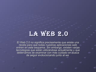La Web 2.0 se refiere a la transición de aplicaciones web tradicionales a tecnologías que permiten una mayor interactividad y colaboración entre usuarios. Aunque no existe una receta única para ello, se pueden examinar tecnologías como las que transforman software de escritorio a plataformas web y permiten una mayor participación de los usuarios.