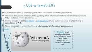 La Web 2.0 es una nueva concepción de la web que permite una mayor interacción entre usuarios, creadores y contenido. Los usuarios ya no solo consumen información sino que pueden publicarla y modificarla fácilmente usando diversas herramientas. Algunas características clave son permitir compartir, comunicarse, colaborar y confiar entre la comunidad de usuarios, así como actualizaciones constantes y contenido generalmente gratuito. Aplicaciones populares son blogs, wikis, YouTube y SlideShare, que facilitan publicar y compartir texto,