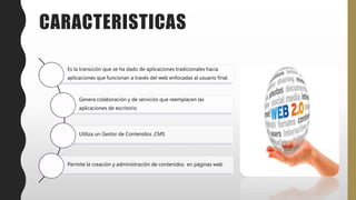 El documento aborda la transición hacia aplicaciones web 2.0, que fomentan la colaboración y el aprendizaje autónomo de los estudiantes mediante herramientas como Facebook y YouTube. Se destaca la importancia de estas herramientas en el desarrollo de habilidades cognitivas y en el trabajo cooperativo. Además, se menciona la creación y gestión de contenido a través de sistemas de gestión de contenido (CMS).