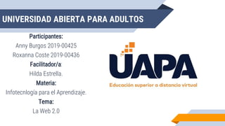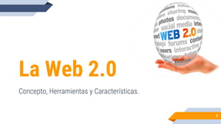 El documento habla sobre la Web 2.0. Define la Web 2.0 como una plataforma que permite a los usuarios interactuar y colaborar generando contenido, a diferencia de la Web 1.0 que solo permitía visualizar contenido de forma pasiva. Enumera herramientas populares de la Web 2.0 como Google, YouTube, Wikipedia y redes sociales. Explica las características principales de la Web 2.0, incluyendo el aumento de blogs, redes sociales, contenido generado por usuarios y etiquetado colectivo.