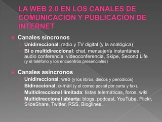 El documento describe las características de los canales síncronos y asíncronos de comunicación, así como las herramientas de la Web 2.0 como blogs, wikis, redes sociales y sus aplicaciones para la educación. Explica que permiten crear, compartir e interactuar contenidos de forma online de manera autónoma y colaborativa para mejorar las competencias digitales y el aprendizaje.