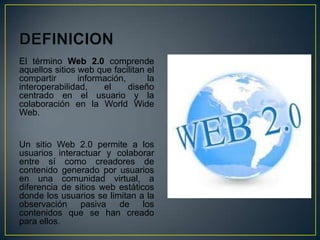El documento define el término Web 2.0 como sitios web que facilitan el compartir información, la interoperabilidad, el diseño centrado en el usuario y la colaboración. Los sitios Web 2.0 permiten a los usuarios interactuar y colaborar como creadores de contenido en una comunidad virtual, a diferencia de sitios estáticos. El término fue acuñado por Dale Dougherty para referirse a la evolución de la web con nuevas reglas y modelos de negocio.