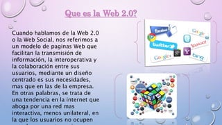 La Web 2.0 se refiere a una tendencia en Internet que promueve una red más interactiva y colaborativa donde los usuarios juegan un papel más activo al crear y compartir contenido a través de plataformas como YouTube, Flickr, blogs y redes sociales. Algunas aplicaciones representativas de la Web 2.0 son Gmail, Flickr, Twitter, Facebook y Ravelry, que permiten a los usuarios publicar, comentar y compartir fotos, videos, actualizaciones y proyectos creativos.