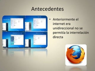 El documento describe la evolución de Internet de unidireccional a la Web 2.0 interactiva, permitiendo que los usuarios compartan y creen contenido. Explica las herramientas de la Web 2.0 como videoconferencias y compartir archivos, y cómo pueden usarse para mejorar la educación al permitir que los profesores y estudiantes cooperen y compartan conocimiento de manera multidireccional. También sugiere que el Sistema Nacional de Nivelación y Admisión podría beneficiarse al permitir que los estudiantes compartan información y diferentes puntos