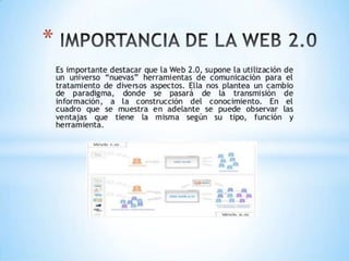 El documento describe el término Web 2.0, el cual se refiere a sitios web que facilitan el compartir información y la colaboración entre usuarios, permitiéndoles interactuar y crear contenido de forma conjunta en una comunidad virtual, a diferencia de sitios estáticos donde los usuarios solo observan pasivamente el contenido.