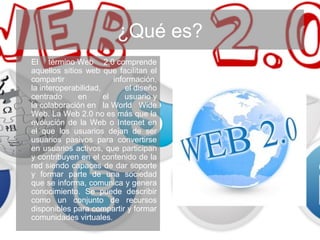 El documento describe la Web 2.0 como sitios web que facilitan el compartir información, la interoperabilidad y la colaboración entre usuarios activos. Explica que la Web 2.0 surgió como una evolución de la Web original en la que los usuarios pasivos se convirtieron en usuarios activos que contribuyen contenido. También resume brevemente la historia de la creación de la Web original y el surgimiento del concepto de Web 2.0 en 2004.