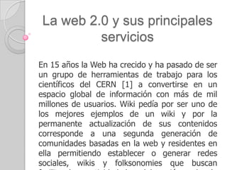 La web 2.0 se centra en servicios interactivos como blogs, redes sociales, compartir videos y podcasts. Algunos servicios clave son blogs para publicar entradas, wikis para editar contenido de forma colaborativa, etiquetado de contenido para describirlo y compartirlo, y servicios de multimedia para almacenar y compartir videos, fotos y podcasts. RSS y la sindicación permiten a los usuarios seguir actualizaciones de contenido de diferentes sitios web.