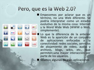La Web 2.0 se refiere a la evolución de Internet hacia aplicaciones que permiten una mayor interacción entre usuarios, como redes sociales, blogs y wikis. Estas herramientas, muchas de las cuales son gratuitas, pueden integrarse en proyectos educativos de forma que los estudiantes puedan escribir, compartir contenido y colaborar en línea. Los blogs en particular son útiles para integrar varias aplicaciones Web 2.0 y crear un ambiente en línea para el aprendizaje.