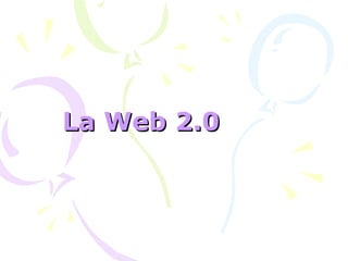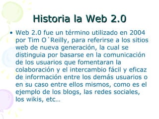 La Web 2.0 se refiere a sitios web basados en la comunicación y colaboración entre usuarios, como blogs, redes sociales y wikis. Surge en 2004 para describir aplicaciones enfocadas al usuario final que generan colaboración y reemplazan aplicaciones de escritorio. La Web 2.0 permite compartir información, subir archivos, editar información, comunicarse y participar en redes sociales. Representa una evolución de la web hacia la interacción bidireccional y multidireccional entre usuarios.