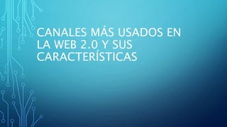 Este documento describe la Web 2.0 y sus características principales. Explica que la Web 2.0 centra la producción en función del usuario final y permite su participación activa en la creación de contenido. También describe los canales más usados en la Web 2.0 como blogs, wikis, Facebook, Twitter y YouTube, los cuales permiten que los usuarios interactúen y compartan información. Finalmente, provee una lista de los canales más populares en Colombia.