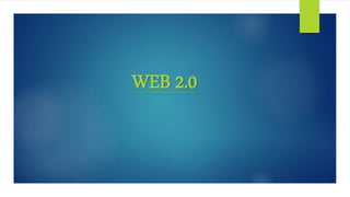 La Web 2.0 se refiere a la evolución de la Web en la que los usuarios pasivos se convierten en usuarios activos que participan y contribuyen al contenido de la red a través de blogs, redes sociales y otras herramientas. Se caracteriza por la participación del usuario como contribuidor activo y no solo como espectador, y por el contenido agregado por los usuarios como valor clave. Algunos servicios asociados incluyen blogs, wikis, redes sociales y entornos para almacenar y compartir contenidos como videos, fotos y presentaciones