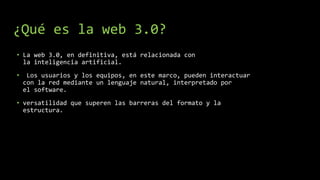 La Web 3.0 se refiere a una red semántica que permite la interacción entre usuarios y equipos mediante lenguaje natural interpretado por software, permitiendo acceder a la información e internet desde cualquier dispositivo. Almacena preferencias de usuarios para ofrecer contenidos más personalizados de forma proactiva.