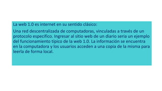 La Web 1.0 se refiere a Internet en su forma clásica como una red descentralizada de computadoras vinculadas a través de un protocolo específico, donde los usuarios accedían a copias locales de la información albergada en los sitios web. La Web 2.0 permitió compartir y interactuar datos con facilidad a través de redes sociales y plataformas de colaboración. La Web 3.0, también conocida como Web semántica, permitirá que usuarios y máquinas interactúen mediante lenguaje natural interpretado por software para acceder a