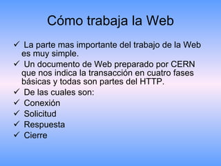 La Web funciona a través de 4 fases básicas de transacción HTTP: 1) conexión, 2) solicitud, 3) respuesta, 4) cierre. En la fase de conexión, el cliente se conecta al servidor. Luego, en la fase de solicitud, el cliente envía una solicitud al servidor especificando el protocolo y método deseado. A continuación, en la fase de respuesta, el servidor ejecuta la solicitud y envía una respuesta al cliente. Finalmente, en la fase de cierre, la conexión se cierra.