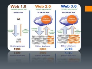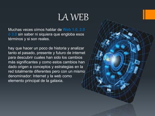 El documento describe la evolución de la web desde su inicio hasta la actualidad. La Web 1.0 consistía en páginas estáticas con contenido fijo creado por los desarrolladores. La Web 2.0 introdujo contenido dinámico y participación de los usuarios a través de blogs, redes sociales y wikis. La Web 3.0 se centra en que las máquinas puedan procesar y comprender mejor los datos semánticos para entender el significado de la información en la web.