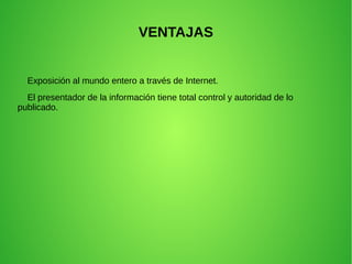 El documento describe las características, ventajas y desventajas de la Web 1.0, 2.0 y 3.0. La Web 1.0 consistía en páginas web estáticas con contenido que solo podía leerse. La Web 2.0 permitió la interacción y colaboración entre usuarios a través de herramientas como blogs y wikis. La Web 3.0 pretende lograr una web semántica con inteligencia y capacidad de distribuir información relevante de forma automática.