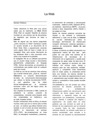 La Web es una enorme red de documentos de hipertexto accesibles a través de Internet mediante el uso de navegadores web. Los navegadores web extraen información de servidores web ubicados en cualquier parte del mundo y muestran los documentos, generalmente en formato HTML, al usuario. Internet es la red descentralizada global que permite el funcionamiento de la Web a través del uso de protocolos como TCP/IP, mientras que las intranets y extranets son redes privadas dentro y entre organizaciones que comparten información a través de protocolos de Internet.