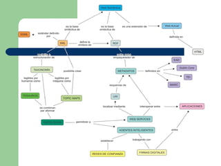 Este documento define la Web Semántica como añadir metadatos semánticos y ontológicos a la World Wide Web para mejorar la interoperabilidad entre sistemas usando agentes inteligentes. Explica las relaciones con Internet, las barreras como la falta de conversión automática de contenido a marcas OWL, y los principales componentes como RDF, RDF Schema y OWL para representar recursos y sus relaciones de forma estructurada. También resume dos noticias sobre el lanzamiento de un buscador semántico en España y los esfuer