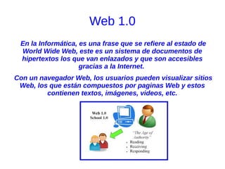 El documento describe la evolución de la World Wide Web de Web 1.0 a Web 3.0. Web 1.0 consistía en páginas web estáticas. Web 2.0 permitió que los usuarios crearan y compartieran contenido, y se basó en aplicaciones alojadas en Internet. Web 3.0 pretende hacer la web más inteligente mediante el uso de la inteligencia artificial y la web semántica.