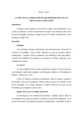 El documento discute el impacto de la Web 3.0 en la formación de profesionales de ciencias de la educación. Explica que la Web 3.0 mejora la obtención de conocimiento a través de inteligencia artificial, cubriendo numerosas áreas profesionales. También señala que presenta ventajas como una mejor organización de la información, pero también desventajas como la complejidad de codificar la información semánticamente y la necesidad de estandarizar los formatos semánticos.
