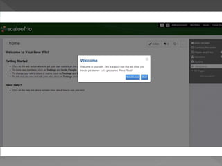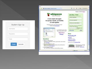 Wikispaces es una plataforma para crear wikis que puede ser útil para individuos, organizaciones y educadores. Los usuarios pueden crear wikis registrándose en el sistema con su nombre, correo electrónico y contraseña. Una vez creada la wiki, los usuarios pueden añadir páginas, imágenes y miembros. Las wikis permiten compartir y editar información de forma colaborativa.